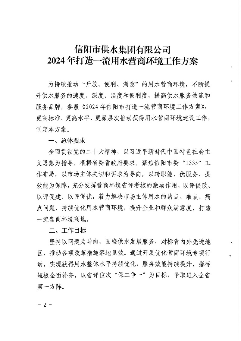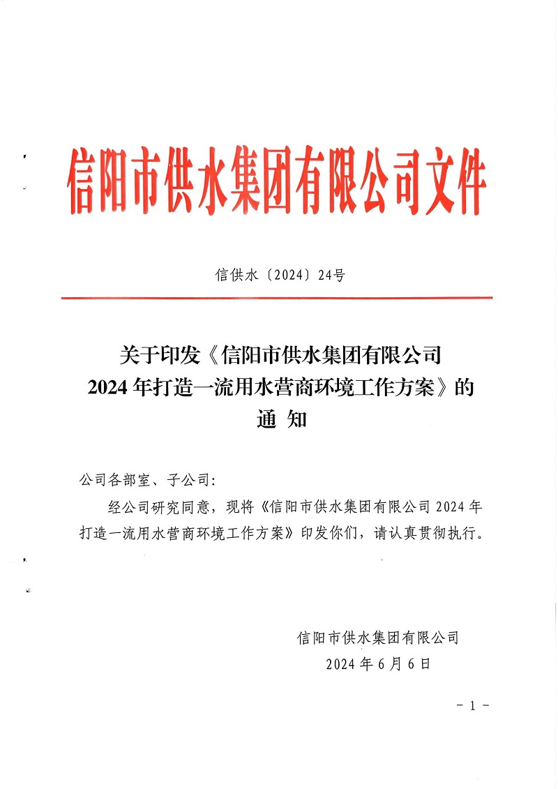 關于印發(fā)信陽市供水集團有限公司2024年打造一流用水營商環(huán)境工作方案的通知
